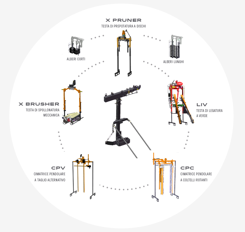 Le teste collegabili al Telaio TMI per eseguire le operazioni di prepotatura, spollonatura, legatura e cimatura .