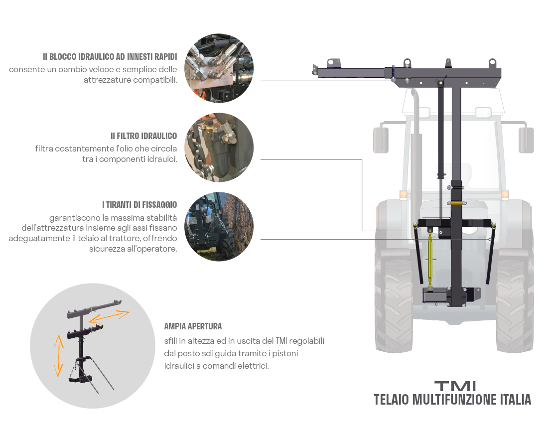 • Il TMI permette di eseguire le operazioni di prepotatura, spollonatura, legatura e cimatura nel vigneto facendo fronte ad un unico telaio.